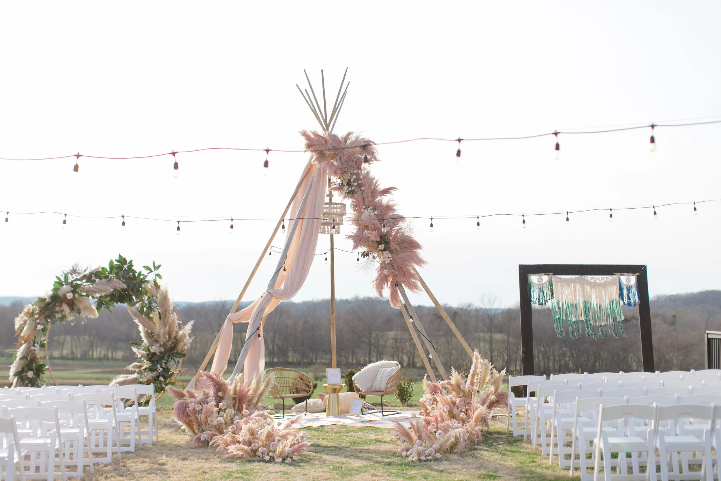 Our A-Frame teepee pole tents are the perfect unique touch for that boho glam wedding. Poles are 24 feet tall and really make a statement. Price includes setup, pole tent, bistro string lights, carpets, pillows/poufs, lanterns for entrance, and chandelier.