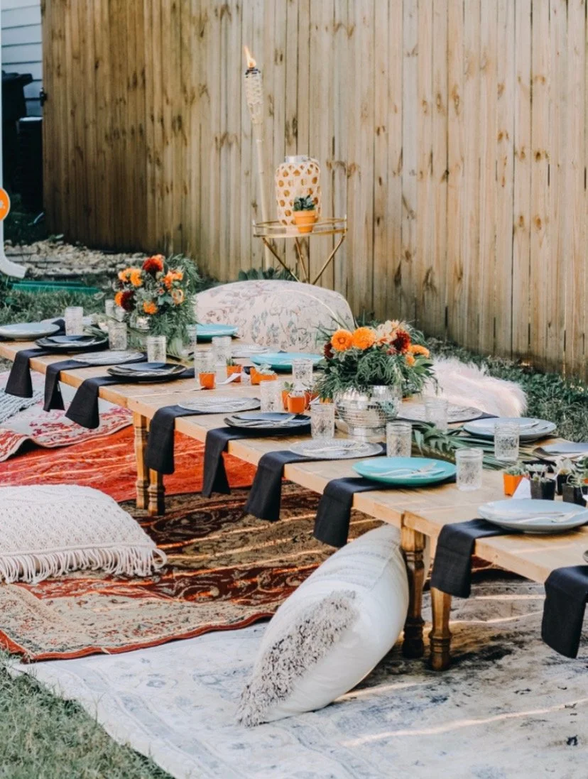 Elevate your dining experience with our Luxury Picnic Dinner Package, a perfect blend of style and comfort. This package includes beautifully crafted tables adorned with a vibrant array of rugs, poufs, and pillows, creating an inviting and eclectic atmosphere. Ideal for gatherings of friends and family, the elevated casual setup encourages relaxed conversation and a sense of community. Each table will comfortably fit 8 people. $500 for 1 table, $300 for each additional table. 3 tables available.